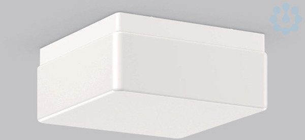 Quadratische Anbauleuchte im klassischen Design. Armatur Kunststoff. Mundgeblasenes Opalglas seidenglanz. Glasbefestigung mit Federsystem. Geeignet für Deckenanbau, Wandanbau. IP 43 Deckenmontage, IP 44 Wandmontage.