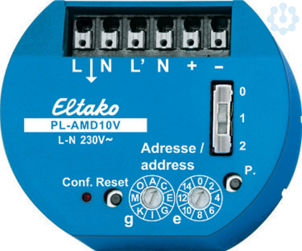 Powerline-Dimm-Aktor 1-10V. 53x43mm, 25mm tief, für Montage in 58mm-Schalterdosen. Zum Schalten und/oder Dimmen über eine 1-10V-Schnittstelle. 1 Schließer nicht potenzialfrei 600VA. Stand-by-Verlust nur 0,5 Watt. Zum Ansteuern und Dimmen an verschiedenen Stellen. Stromsenke von max. 30mA für aktive und passive EVG s. Für die Ansteuerung ist ein Powerline Sensor-Eingang erforderlich. Für die Adresszuweisung befinden sich auf der Vorderseite zwei Drehschalter: Der linke Drehschalter bestimmt die Gruppenadresse g mit 16 alphabetischen Werten von A bis P. Der rechte Drehschalter bestimmt die Elementadresse e mit 16 numerischen Werten von 0 bis 15. Oberhalb davon befindet sich ein Schiebeschalter, welcher hier keine Funktion hat. Links von den Drehschaltern befindet sich eine rote LED, welche alle Aktivitäten anzeigt. Daneben befindet sich die Reset-Taste und rechts davon ein Service Pin. Funktionen gemäß Bedienungsanleitung. Die oben liegenden Anschlussklemmen sind Steckklemmen für Leiterquerschnitte von 0,2mqm b