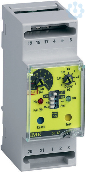 IME Differenzstromrelais Delta D2-L, Typ A, 2-modulig, Einstellbarer Auslösestrom Idn 30 mA...30 A, Hilfsspannung 230 V 50Hz, Relaisausgang: 1 Wechsler, Dauerhafter Funktionstest, Manuelles oder automatisches Rücksetzen (3 Versuche).