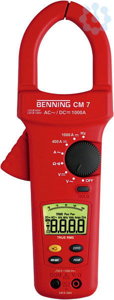Benning CM 7 True RMS-Digital-Stromzangen-Multimeter. Anzeige digital. Analoge Balkenanzeige. 3 ¾-stellige LCD-Anzeige (4000 Punkte). Mit Bildschirmhintergrundbeleuchtung. Strommessbereich/DC 0.1 A - 1000 A. Strommessbereich/AC 0.1 A - 1000 A. Stromart Gleich-/Wechselstrom. Echteffektivwertmessung (TRMS) ja.Spannungsmessung/AC 0.1 V - 750 V. Spannungsmessung/DC 0.1 V - 1000 V. Widerstandsmessbereich 0.1 Ohm - 400 Ohm. Frequenzmessung 1 Hz - 400 Hz. Frequenzmessung ja. Durchgangsprüfung. Messbereichswahl automatisch. Abschaltung automatisch. Batterieunterspannungsanzeige automatisch. Momentanwertspeicher Hold. Maximalwertspeicher MAX. Minimalwertspeicher MIN. Spitzenwertspeicher PEAK. Zangenöffnung 53 mm. Messkreiskategorie Cat IV. Max. Spannung Messkreiskategorie 600 V. Messkreiskategorie Cat III. Max. Spannung Messkreiskategorie 1000 V. Inklusive Tasche, 9 V Block LR61 Batterie, Messleitungen.