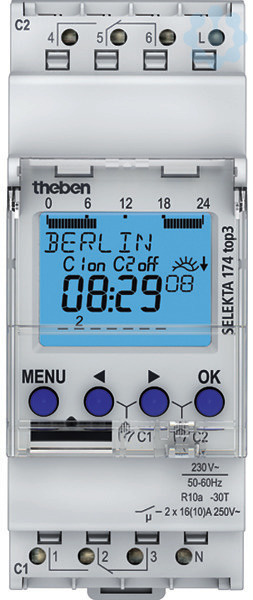 Digitale Zeitschaltuhr für DIN-Schiene, 2 Kanäle, Astro- und Wochenprogramm, Breite 2 TE, Astronomische Schaltfunktion, Positionsdaten über Koordinaten oder Länder-Städteliste programmierbar, App-Programmierung möglich, Sichere Übertragung per optionalem Bluetooth Low Energy OBELISK top3, Maximale Manipulationssicherheit, Zeitschaltprogramme können nur dann von der App in die Uhr übertragen werden, wenn der Bluetooth OBELISK top3 in der Uhr steckt, 100 % kompatibel zu top2, 600 Watt LED-Leistung, 800 Ampere/200 Mikrosekunden Einschaltstrom, 0,4 Watt Stand-by Leistung, DuoFix Steckklemmen, Gangreserve und programmierte Sommer-/Winterzeitumstellung, OBELISK-Schnittstelle für PC-Programmierung