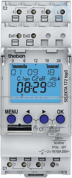 Digitale Astro-Zeitschaltuhr für DIN-Schiene, 2 Kanäle, Wochenprogramm, Astronomische Schaltfunktion, Positionsdaten über Koordinaten oder Länder-Städteliste programmierbar, Astroimpuls, 3 verschiedene Dämmerungsbereiche einstellbar, 2 externe Eingänge, 3 Sonderprogramme, Kanalumschaltung und Kanalverriegelung, Breite 2 TE, App-Programmierung möglich, Sichere Übertragung per optionalem Bluetooth Low Energy OBELISK top3, Maximale Manipulationssicherheit, Zeitschaltprogramme können nur dann von der App in die Uhr übertragen werden, wenn der Bluetooth OBELISK top3 in der Uhr steckt, 100 % kompatibel zu top2, 600 Watt LED-Leistung, 800 Ampere/200 Mikrosekunden Einschaltstrom, 0,4 Watt Stand-by Leistung, DuoFix Steckklemmen, Gangreserve und programmierte Sommer-/Winterzeitumstellung, OBELISK-Schnittstelle für PC-Programmierung