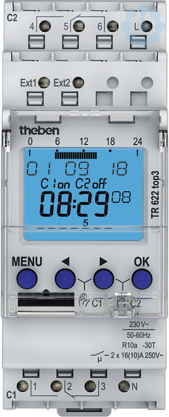 Digitale Zeitschaltuhr für DIN-Schiene, 2 Kanäle, Wochenprogramm, 2 externe Eingänge, 3 Sonderprogramme, Kanalumschaltung und Kanalverriegelung, Breite 2 TE, App-Programmierung möglich, Sichere Übertragung per optionalem Bluetooth Low Energy OBELISK top3, Maximale Manipulationssicherheit, Zeitschaltprogramme können nur dann von der App in die Uhr übertragen werden, wenn der Bluetooth OBELISK top3 in der Uhr steckt, 100 % kompatibel zu top2, 600 Watt LED-Leistung, 800 Ampere/200 Mikrosekunden Einschaltstrom, 0,4 Watt Stand-by Leistung, DuoFix Steckklemmen, Gangreserve und programmierte Sommer-/Winterzeitumstellung, OBELISK-Schnittstelle für PC-Programmierung