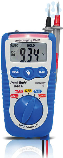 Ein sehr handliches, sicheres Messgerät mit integriertem Schutzrahmen im Taschenformat für AC/DC-Spannungs-, Strommessungen, sowie Widerstands- und berührungslose Wechselspannungsmessungen, mit eingebauter Taschenlampe. Dieses Gerät nutzt einen PTC als selbstrücksetzende Sicherung für den mA-Bereich. Die Prüfleitungen sind abnehmbar und lassen sich mit allen 4mm Sicherheitsbuchsen verbinden.