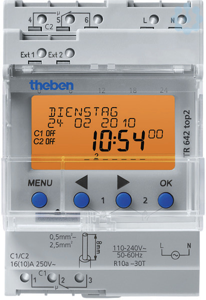 2-Kanal-Jahreszeitschaltuhr, Reiheneinbaugehäuse, Breite 3 TE, Jahres-und Astro-Programm, Schnittstelle für OBELISK top2 Speicherkarte (PC-Programmierung), 6 Jahre Gangreserve (Lithium-Batterie), Automatische Sommer-/Winterzeitumschaltung, EIN-AUS Schaltzeiten, Impulsprogramm, Zyklusprogramm, Umfangreiche Jahresuhrfunktionen, Astronomische Schaltfunktion (automatische Berechnung der Sonnenauf-und Untergangszeiten für das ganze Jahr), Astro-Offset, Astro-Impuls, Schaltungsvorwahl, Dauerschaltung EIN/AUS, Ablauf-Timer, Integrierter Betriebsstundenzähler, Externer Taster-/Schaltereingang, Ferienprogramm, 2 Zufallsprogramme, Displaybeleuchtung (abschaltbar), PIN-Codierung, Nulldurchgangschaltung, DuoFix Federsteckklemmen für jeweils 2 Leiter