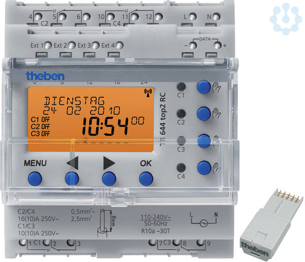 4-Kanal-Jahreszeitschaltuhr, RC: Zeitsynchronisation durch Anschluss einer externen DCF-oder GPS-Antenne (bei GPS zusätzlich Positionsbestimmung für Astro-Programm), 4 Kanal Erweiterungsmodul (EM 4 top2) und LAN-Modul (EM LAN top2) anschließbar, Reiheneinbaugehäuse, Breite 4 TE, Jahres-und Astro-Programm, Schnittstelle für OBELISK top2 Speicherkarte (PC-Programmierung), OBELISK Speicherkarte im Lieferumfang, 6 Jahre Gangreserve (Lithium-Batterie), Automatische Sommer-/Winterzeitumschaltung, EIN-AUS Schaltzeiten, Impulsprogramm, Zyklusprogramm, Umfangreiche Jahresuhrfunktionen, Astronomische Schaltfunktion (automatische Berechnung der Sonnenauf-und Untergangszeiten für das ganze Jahr), Astro-Offset, Astro-Impuls, Schaltungsvorwahl, Dauerschaltung EIN/AUS, Ablauf-Timer, Integrierter Betriebsstundenzähler, Externer Taster-/Schaltereingang, Ferienprogramm, 2 Zufallsprogramme, Displaybeleuchtung (abschaltbar), PIN-Codierung, Nulldurchgangschaltung, DuoFix Federsteckklemmen für jeweils 2 Leiter