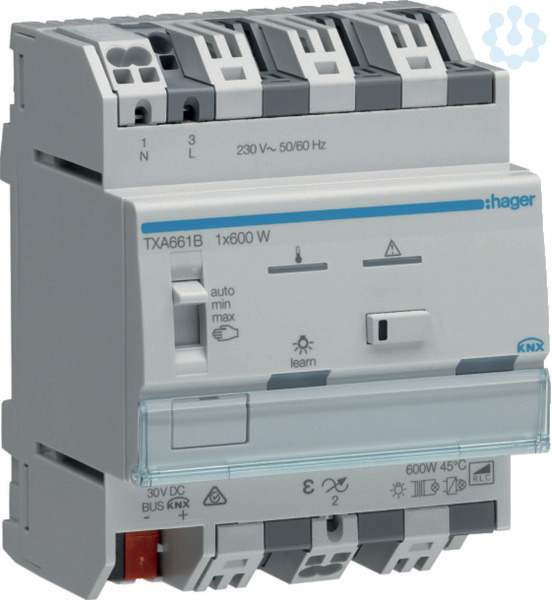 Universal-Dimmaktor 1-fach KNX easy, 1x600W, ESL/LED. Universal-Dimmaktor REG zum Schalten/Dimmen und zur automatischen Erkennung der Lastart (Autodetect-Verfahren). Mit Easydetect-Verfahren zur Optimierung des Dimm-Bereiches mittels Tastendruckmodus am externen Sensor, am Gerät oder über ein Objekt. Reiheneinbaugerät mit integriertem Busankoppler, QuickConnect Steckklemmen für Hilfsspannung, KNX Busanschluss, Lastanschluss und Beschriftungsfeld. Bedientaste(n) für Handbetrieb mit Status-LED (Einflächenbedienung), beleuchtete Dimm-Modus-Taste. Kontroll-LED für Kurzschluss, Überlastschutz und Überhitzungsschutz. Schiebeschalter auto/min/max./Hand und beleuchtete Programmier-Taste. Funktionen: Schalten/Dimmen von Lasten (Lastangaben des Hersteller beachten). Dimmkanal-Auswahl für Dimmen, EIN/AUS, Zeitschalterfunktion mit Ausschaltvorwarnung, Zwangssteuerung mit der jeweiligen Statusanzeige, Automatikfunktion de-/aktivierbar, 64 Szenenfunktionen pro Kanal einstellbar. Handbedienung schalten und dimmen ohne Bus m