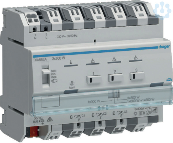 Universal-Dimmaktor 3-fach KNX easy, 3x300W, ESL/LED. Universal-Dimmaktor REG zum Schalten/Dimmen und zur automatischen Erkennung der Lastart (Autodetect-Verfahren). Mit Easydetect-Verfahren zur Optimierung des Dimm-Bereiches mittels Tastendruckmodus am externen Sensor, am Gerät oder über ein Objekt. Reiheneinbaugerät mit integriertem Busankoppler, QuickConnect Steckklemmen für Hilfsspannung, KNX Busanschluss, Lastanschluss und Beschriftungsfeld. Bedientaste(n) für Handbetrieb mit Status-LED (Einflächenbedienung), beleuchtete Dimm-Modus-Taste. Kontroll-LED für Kurzschluss, Überlastschutz und Überhitzungsschutz. Schiebeschalter auto/min/max./Hand und beleuchtete Programmier-Taste. Funktionen: Schalten/Dimmen von Lasten (Lastangaben des Hersteller beachten). Dimmkanal-Auswahl für Dimmen, EIN/AUS, Zeitschalterfunktion mit Ausschaltvorwarnung, Zwangssteuerung mit der jeweiligen Statusanzeige, Automatikfunktion de-/aktivierbar, 64 Szenenfunktionen pro Kanal einstellbar. Handbedienung schalten und dimmen ohne Bus m