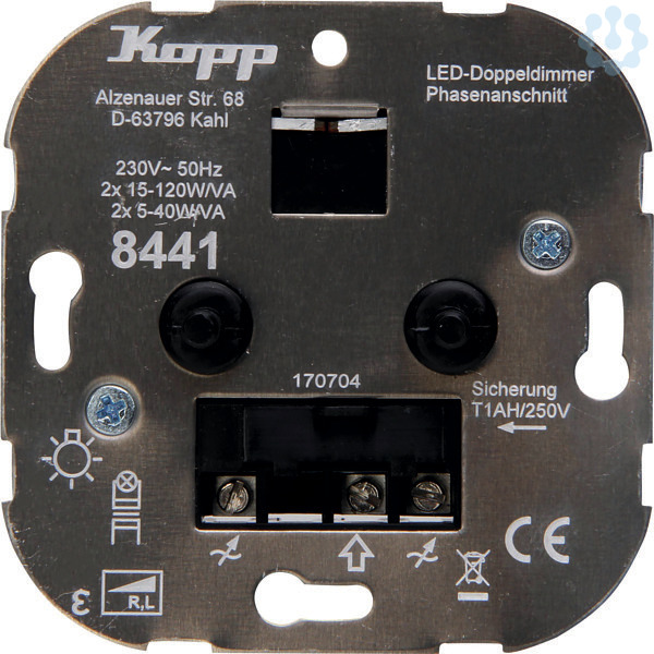 Doppel-Dreh-Ausschalter - LED Dimmer, für Glüh und 230 V Halogenlampen, dimmbare LED´s, sowie für Niedervolt-Halogenlampen mit konventionellen Trafos. Welle 4 mm mit Adapter auf 6 mm abgeflacht, Phasenanschnitt RL 2x 15-120 W/VA, LED 2x 5-40 W