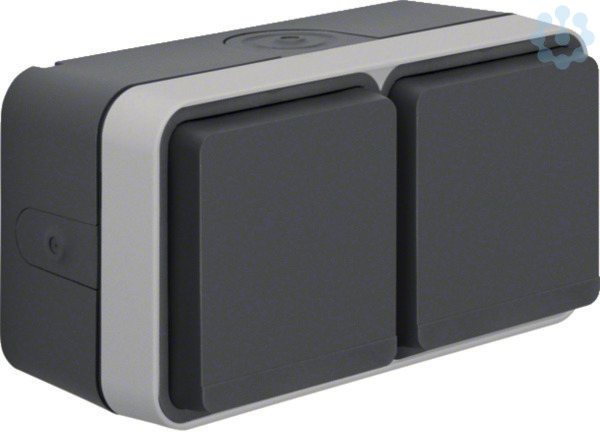 Steckdose SCHUKO 2fach waagerecht mit Klappd., 4 Leitungseinf. AP W.1 grau. Steckdose SCHUKO® 2-fach waagerecht mit Klappdeckel AP, IP55. Für waagerechte Montage, Einsätze durchverdrahtet, mit Steckklemmen, mit einer Einführung für 2 Leitungen und einer Einführung für Leitung oder Rohr, die obere und untere Einführung für Leitungen sind seitlich angeordnet und daher besonders geeignet für die Montage neben Türrahmen o. ä. 2 zusätzliche seitliche Leitungseinführungen, durch die seitlichen Leitungseinführungen besonders geeignet für die Montage über Werkbänke, vollflächige Dichtung unter dem Gehäuseboden zur Abdichtung der Gehäuserückseite, mit zufallendem Klappdeckel, manuell einrastbar, um den Schutzgrad IP55 zu erreichen, gut zugängliche, trichterförmige Montagelöcher in den Gehäusen, eine Wago 2-Leiter Verbindungsklemme für Verdrahtung beiliegend, zwei Einrastplätze für Wago 2-Leiter Verbindungsklemmen im Gehäuseboden, viel Platz zur Verdrahtung unter den Sockeln der Einsätze (Hohlboden), einfache Montage d