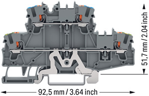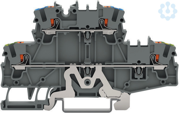 Doppelstockklemme. Schutzleiter-/Durchgangsklemme. mit Drücker. 2,5 mm². PE/N. für Anwendungen Ex e II geeignet. ohne Beschriftungsträger. Leitereinführung OG, blau bedruckt. für Tragschiene 35 x 15 und 35 x 7,5. Push-in CAGE CLAMP®. 2,50 mm². grau