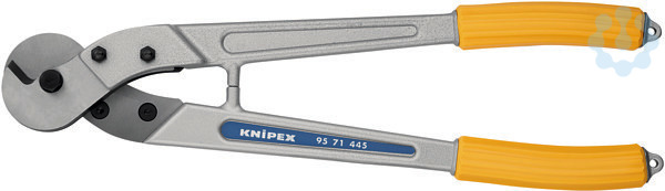 95 71 445 Drahtseil- und Kabelschere Für Drahtseile und Rundeisen, Cu-und Al-Kabel. Eignen sich zum Trennen von Freileitungsseilen mit Zugentlastungsdraht. Winklige Schneidspitzen ermöglichen ein Durchtrennen einzelner Seilstränge. Optimale Übersetzung für hohe Schneidleistung. Verschraubter Messerkopf, auswechselbar. Geringes Gewicht. - Schneidwert Cu-Kabel, mehrdrähtig: 95mm² - Schneidwert Cu-Kabel, feindrähtig (Durchmesser): Ø 10,0mm² - Schneidwerte Drahtseil (Durchmesser): Ø 10,0mm - Schneidwerte mittelharter Draht (Durchmesser): Ø 7,0mm - Schneidwerte Eisen (Durchmesser): Ø 7mm - AWG: 4?/ 0
