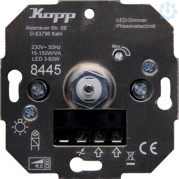 Druck-Wechselschalter - LED Dimmer, für Glüh und 230 V Halogenlampen, dimmbare LED´s, sowie für NV-Halogenlampen mit elektronischen Trafos. Einstellbare Grundhelligkeit, mit Softrastung, Welle 4 mm, Phasenabschnitt RC 15-150 W/VA, LED 3-50 W, mit Befestigungsmutter und Wellenadapter