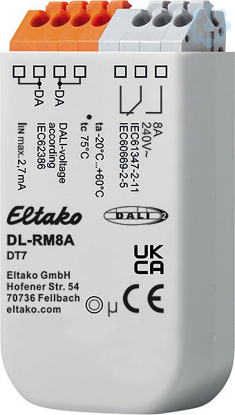 Modul zum Steuern eines Relaiskontakts über den DALI-Bus (DT7) für Leuchteneinbau und UP-Dose. 59x33x15mm. Schutzart IP20. DALI-Stromaufnahme 2,7mA. Kompaktes Relaismodul zum direkten Ansteuern von 230V AC-Lasten über DALI. Einfaches Einbinden von Lasten ohne DALI-Eingang in einen DALI-Kreis, die Lasten können über DALI-Befehle ein- und ausgeschaltet werden. Die Funktion des Geräts entspricht dem Standard für DALI Device Type 7 ? Schaltfunktion (ab Firmware 2.0). Einstellbares Verhalten für Power-Up und für Wegfall der Busversorgung. Die Versorgung des DALI-RM8 erfolgt über den DALI-Bus, es ist keine zusätzliche Versorgung notwendig. Einschalten im Nulldurchgang. Das Interface repräsentiert einen Teilnehmer am Bus und ist entsprechend adressierbar. Konfiguration über PC-Software DALI-Cockpit. DALI-Funktionen und Befehlssatz: Der DALI-RM8 bietet die Möglichkeit Lasten an den DALI-Bus anzubinden und anschließend ein- und auszuschalten. Der DALI-RM8 ist ein Steuergerät für nicht dimmbare Lasten basierend auf der