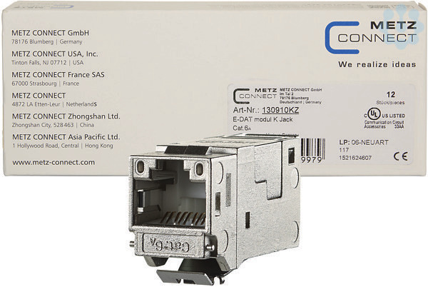 Modulare Anschlusseinheit Cat.6, A, RJ45Cat.6, A Komponentenprüfung nach ISO/IEC 11801 Ed.2.2:2011-06, DIN EN 50173-1:2011-09, TIA/EIA-568-C.2 (2009-08) und IEC 60603-7-51 Ed.1 (12/2008), GHMT zertifiziertEinhaltung der Klasse E, A nach ISO/IEC 11801 Ed.2.2:2011-06, DIN EN 50173-1:2011-09getestet: Link bis 500 MHz, für 10 GBit Ethernet (IEEE 802.3an), Remote Powering (PoE, PoE plus, UPoE und 4PPoE) und HDBaseT geeignet, montagefreundlicher Anschluss der 2- bis 4-paarigen Datenleitung AWG 26/1 - 22/1 (eindrähtig) und Litzenleiter mit 7-drähtiger Cu-Litze AWG 26/7 - 22/7 (mehrdrähtig) an IDC-Schneidklemmen, Kennzeichnung der Adernbelegung T568A und T568B, leichtes und schnelles Einlegen der Adernpaare in das E-DAT modul Ladestück, Modulgehäuse aus Zinkdruckguss, veredelt, Montage ohne Spezialwerkzeug, Zugentlastung mit Kabelbinder am Modul, Einbauform: Keystone, Kabelzuführung 180°, Lieferung in einer 12er Verpackung, nicht einzeln lieferbar