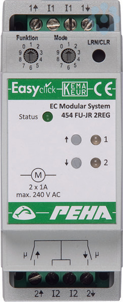 Das Easyclick-Modul-JR für 2 Motoren empfängt seine Telegramme über das externe Easyclick-Antennen-Modul und setzt die eingestellten Funktionen und Parameter über seine Leistungsteile um. Die Easyclick-Module werden über Modular-Stecker-Kabel miteinander verbunden. Das Easyclick-Modul-JR dient zum Steuern von Jalousien/ Rollladen unter Berücksichtigung von verschiedenen über Drehschalter auswählbaren Funktionen und Parametern. Für jeden eingelernten Sender kann individuell eine Funktion festgelegt werden. Standardfunktion: AUF/STOP/AB mit Lamellenverstellung. Wählbare Funktionen sind z. B. AUF/STOP/AB ohne Lamellenverstellung, Tasterfolger für Lamellenverstellung, Sicherheitsfunktion zum Blockieren, Lichtszenen AUF/AB etc.