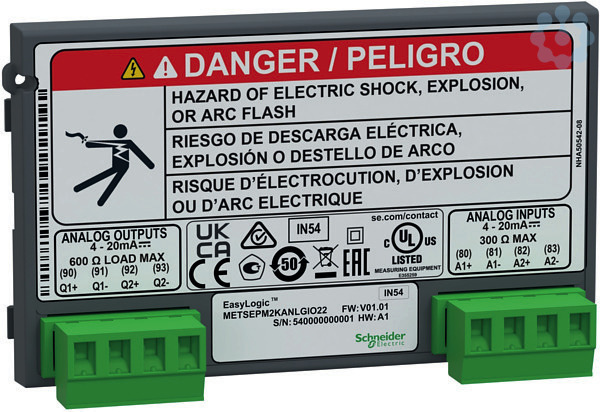 Analog-E/A-Optionsmodul, das mit den PowerLogic PM2x30 Geräten kompatibel ist und zusätzliche analoge Ein- und Ausgänge bietet. 2 Analogeingänge (4-20 mA). 2 Analogausgänge (4-20 mA) für Ströme, Spannungen,Leistung, Leistungsfaktor. Analoge Ein- und Ausgänge werden über die ION-Setup-Software eingerichtet und konfiguriert. Die Optionsmodule werden auf der Rückseite des Zählers angebracht und dienen zum Anschluss der Steuerspannung und des Schnittstellenbusses. Die PowerLogic-Geräte PM2x30 erlauben maximal 1 Ein-/Ausgangs-Optionsmodul pro Zähler.