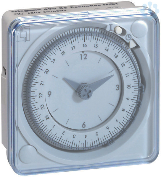 Legrand EconoRex MQT, analoge Tageszeitschaltuhr mit Quarzmotor (Ganggenauigkeit +/- 2,5 Sek/Tag, Gangreserve 100 Std.) für Fronttafeleinbau und Wandmontage, 1 Kanal, Betriebsspannung 230 V 50/60 Hz. Flachsteckeranschluss, Zeiger vorwärts und rückwärts drehbar, dadurch leichte Umstellung (z.B. Sommer-/Winterzeit), Tagesscheibe mit unverlierbaren Segmenten, kürzeste Schaltzeit 20 Min., Wandmontage mittes Wandhalterung Best.-Nr. 049594 optional,