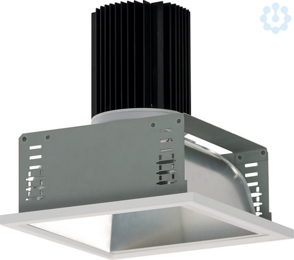 Einbaudownlight quadratisch mit Kantenlänge 235 mm mit LED-Modul, bestehend aus Reflektorgehäuse und Geräteträger. Bestückt mit RIDI-LED-Modul, 2000, 3000, 4000 und 5000 Lumen mit Passiv-Kühlkörper. Schutzart raumseitig IP40, deckenseitig IP20. Kantenlänge 235 mm. Reflektor aus reflexionsverstärktem, matt eloxiertem Reinstaluminium mit Silberbeschichtung, breitstrahlend. Reflektorgehäuse: Stabiler Einbaurahmen aus verzinktem Stahlblech mit werkzeuglos zu betätigenden Befestigungsklammern für den Deckeneinbau. Einbaurahmen zur werkzeuglosen Aufnahme des Dekorrahmens bzw. Zubehörs (separat zu bestellen). Dekorrahmen mit werkzeugloser Montage (Zubehör, separat zu bestellen). Funktionsmodul aus weißem Polycarbonat, zur Aufnahme des Reflektors über Bajonettverschluss. Diffusor aus transparentem, innen satiniertem Polycarbonat zum Schutz der LEDs, in Funktionsmodul eingeclipst (Diffusor opal auf Anfrage lieferbar). Geräteträger: Geräteträgerplatte aus verzinktem Stahlblech, trägt das Betriebsgerät, die Netzanschlus