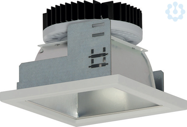 Einbaudownlight quadratisch mit Kantenlänge 150 mm mit LED-Modul, bestehend aus Reflektorgehäuse und Geräteträger. Bestückt mit RIDI-LED-Modul, 1100 und 2000 Lumen mit Passiv-Kühlkörper. Schutzart raumseitig IP40, deckenseitig IP20. Kantenlänge 150 mm. Reflektor aus reflexionsverstärktem, matt eloxiertem Reinstaluminium mit Silberbeschichtung, breitstrahlend. Reflektorgehäuse: Stabiler Einbaurahmen aus verzinktem Stahlblech mit werkzeuglos zu betätigenden Befestigungsklammern für den Deckeneinbau. Einbaurahmen zur werkzeuglosen Aufnahme des Dekorrahmens bzw. Zubehörs (separat zu bestellen). Dekorrahmen mit werkzeugloser Montage (Zubehör, separat zu bestellen). Funktionsmodul aus weißem Polycarbonat, zur Aufnahme des Reflektors über Bajonettverschluss. Diffusor aus transparentem, innen satiniertem Polycarbonat zum Schutz der LEDs, in Funktionsmodul eingeclipst (Diffusor opal auf Anfrage lieferbar). Geräteträger: Geräteträgerplatte aus verzinktem Stahlblech, trägt das Betriebsgerät, die Netzanschlusssteckklemme