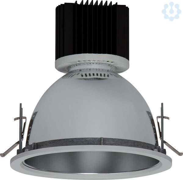 Einbaudownlight Durchmesser 235 mm mit LED-Modul, bestehend aus Reflektorgehäuse und Geräteträger. Bestückt mit RIDI-LED-Modul, 2000, 3000, 4000 und 5000 Lumen mit Passiv-Kühlkörper. Schutzart raumseitig IP40, deckenseitig IP20. Reflektorgehäuse: Stabiler Einbauring aus Metalldruckguss mit werkzeuglos zu betätigenden Befestigungsklammern für den Deckeneinbau und Reflektorhalteklammern. Integrierte Haltevorrichtung zur werkzeuglosen Aufnahme des Dekorrings bzw. Zubehörs. Dekorring aus weißem Polycarbonat mit Bajonettverschluss. Funktionsmodul aus weißem Polycarbonat, zur Aufnahme des Reflektors über Bajonettverschluss. Diffusor aus transparentem, innen satiniertem Polycarbonat zum Schutz der LEDs, in Funktionsmodul eingeclipst (Diffusor opal auf Anfrage lieferbar). Geräteträger: Geräteträgerplatte aus verzinktem Stahlblech, trägt das Betriebsgerät, die Netzanschlusssteckklemme mit Kabelzugentlastung und die Verbindungsleitung zum LED-Modul. Abdeckung aus thermisch beständigem Polycarbonat aufgeclipst. Gerätetr