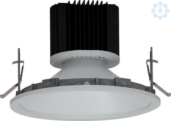 Einbaudownlight Durchmesser 235 mm mit LED-Modul, bestehend aus Reflektorgehäuse und Geräteträger. Bestückt mit RIDI-LED-Modul, 2000, 3000, 4000 und 5000 Lumen mit Passiv-Kühlkörper. Schutzart raumseitig IP40, deckenseitig IP20. Reflektorgehäuse: Stabiler Einbauring aus Metalldruckguss mit werkzeuglos zu betätigenden Befestigungsklammern für den Deckeneinbau und Reflektorhalteklammern. Integrierte Haltevorrichtung zur werkzeuglosen Aufnahme des Dekorrings bzw. Zubehörs. Dekorring aus weißem Polycarbonat mit Bajonettverschluss. Funktionsmodul aus weißem Polycarbonat, zur Aufnahme des Reflektors über Bajonettverschluss. Diffusor aus transparentem, innen satiniertem Polycarbonat zum Schutz der LEDs, in Funktionsmodul eingeclipst (Diffusor opal auf Anfrage lieferbar). Geräteträger: Geräteträgerplatte aus verzinktem Stahlblech, trägt das Betriebsgerät, die Netzanschlusssteckklemme mit Kabelzugentlastung und die Verbindungsleitung zum LED-Modul. Abdeckung aus thermisch beständigem Polycarbonat aufgeclipst. Gerätetr
