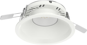 Einbaudownlight Durchmesser 150 mm mit RIDI LED-Modul und Passivkühlkörper, bestehend aus Reflektorgehäuse und Geräteträger. Stabile Aluminiumplatte mit werkzeuglos zu betätigenden Befestigungsklammern für den Deckeneinbau. Darunter angebrachter Light-Engine mit Funktionsmodul aus weißem Polycarbonat, zur Aufnahme des Reflektors über Bajonettverschluss. Diffusor aus transparentem, innen satiniertem Polycarbonat zum Schutz der LEDs. Hocheffizientes RIDI-LED-Modul bestückt mit Mid-Power-LEDs für gleichmäßige Ausleuchtung und maximale Effizienz. Treiber als unabhängiges Gerät mit Netzanschlussklemme, Kabelzugentlastung und Verbindungsleitung zum LED-Modul. Schutzart raumseitig IP44, deckenseitig IP20. Durchmesser 150 mm. Reflektor weiß (ähnlich RAL9016, reflexionsverstärkt), aus Polycarbonat. Montage: Befestigungsklammern für Klemmdicken von 0 bis 20 mm standardmäßig an das Leuchtengehäuse vormontiert.