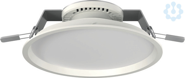 Einbaudownlight Durchmesser 235 mm mit RIDI LED-Modul und Passivkühlkörper, bestehend aus Reflektorgehäuse und Geräteträger. Stabile Aluminiumplatte mit werkzeuglos zu betätigenden Befestigungsklammern für den Deckeneinbau. Darunter angebrachter Light-Engine mit Funktionsmodul aus weißem Polycarbonat, zur Aufnahme des Reflektors über Bajonettverschluss. Diffusor aus transparentem, innen satiniertem Polycarbonat zum Schutz der LEDs. Hocheffizientes RIDI-LED-Modul bestückt mit Mid-Power-LEDs für gleichmäßige Ausleuchtung und maximale Effizienz. Treiber als unabhängiges Gerät mit Netzanschlussklemme, Kabelzugentlastung und Verbindungsleitung zum LED-Modul. Schutzart raumseitig IP44, deckenseitig IP20. Durchmesser 235 mm. Reflektor weiß (ähnlich RAL9016, reflexionsverstärkt), aus Polycarbonat, mit Scheibe. Montage: Befestigungsklammern für Klemmdicken von 0 bis 20 mm standardmäßig an das Leuchtengehäuse vormontiert.
