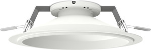 Einbaudownlight Durchmesser 235 mm mit RIDI LED-Modul und Passivkühlkörper, bestehend aus Reflektorgehäuse und Geräteträger. Stabile Aluminiumplatte mit werkzeuglos zu betätigenden Befestigungsklammern für den Deckeneinbau. Darunter angebrachter Light-Engine mit Funktionsmodul aus weißem Polycarbonat, zur Aufnahme des Reflektors über Bajonettverschluss. Diffusor aus transparentem, innen satiniertem Polycarbonat zum Schutz der LEDs. Hocheffizientes RIDI-LED-Modul bestückt mit Mid-Power-LEDs für gleichmäßige Ausleuchtung und maximale Effizienz. Treiber als unabhängiges Gerät mit Netzanschlussklemme, Kabelzugentlastung und Verbindungsleitung zum LED-Modul. Schutzart raumseitig IP44, deckenseitig IP20. Schutzklasse I. Durchmesser 235 mm. Reflektor weiß (ähnlich RAL9016, reflexionsverstärkt), aus Polycarbonat. Montage: Befestigungsklammern für Klemmdicken von 0 bis 20 mm standardmäßig an das Leuchtengehäuse vormontiert.