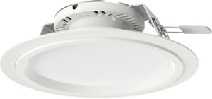 Einbaudownlight Durchmesser 195 mm mit RIDI LED-Modul und Passivkühlkörper, bestehend aus Reflektorgehäuse und Geräteträger. Stabile Aluminiumplatte mit werkzeuglos zu betätigenden Befestigungsklammern für den Deckeneinbau. Darunter angebrachter Light-Engine mit Funktionsmodul aus weißem Polycarbonat, zur Aufnahme des Reflektors über Bajonettverschluss. Diffusor aus transparentem, innen satiniertem Polycarbonat zum Schutz der LEDs. Hocheffizientes RIDI-LED-Modul bestückt mit Mid-Power-LEDs für gleichmäßige Ausleuchtung und maximale Effizienz. Treiber als unabhängiges Gerät mit Netzanschlussklemme, Kabelzugentlastung und Verbindungsleitung zum LED-Modul. Leuchte geeignet für den Einsatz in Notbeleuchtungsanlagen. Schutzart raumseitig IP44, deckenseitig IP20. Schutzklasse I. Hinweis: Anschlussklemmen für eine Leitung max. 1,5 mm². Zur Durchgangsverdrahtung von Leuchte zu Leuchte ist Zubehör Anschlussleitungen und T-Verbinder separat zu bestellen. Durchmesser 195 mm. Reflektor weiß (ähnlich RAL9016, reflexionsve