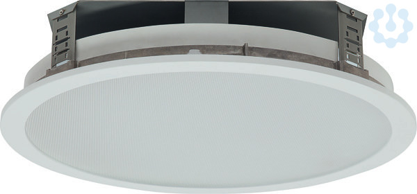 Einbaudownlight Durchmesser 410 mm. Stabiler Einbauring aus Metalldruckguss mit werkzeuglos zu betätigenden Befestigungsklammern für den Deckeneinbau. Integrierte Haltevorrichtung zur werkzeuglosen Aufnahme des Dekorrings bzw. Zubehörs. Dekorring aus weißem Polycarbonat mit Bajonettverschluss. LED-Module als Flächenplatine ausgebildet. Mid-Power-LEDs für gleichmäßige Ausleuchtung und maximale Effizienz. LED-Treiber in Leuchtengehäuse eingebaut. Schutzart raumseitig IP44, deckenseitig IP20. Abdeckscheibe mit geprägten Mikroprismen aus UV-beständigem PMMA. LEDs erscheinen als mehrere Punkte. Montage: Montage in gesägten Deckenöffnungen. Befestigungsklammern für Klemmdicken von 0 bis 25 mm.