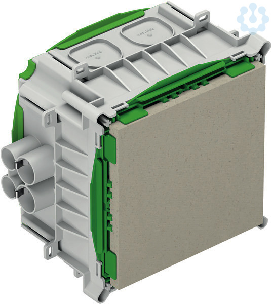 Universelles Einbaugehäuse, für Fertigteilbau, halogenfrei, zum Einbau von NV/HV/LED-Leuchten und Lautsprechern, Melde- und Rufsystemen, geeignet für Klebebefestigung, für die Installation von VDE geprüften Leuchten nach DIN EN 60598 (VDE 0711), sowie mit F-Kennzeichnung oder MM-Kennzeichnung, maximale Einbauhöhe für Leuchten, Lautsprecher, Melde und Rufsystemen: 100mm, Lampenleistung LED max. 20 W, Lampenleistung Halogen max. 50 W, zusätzliche Einführungen 4 x bis M40, Auslassöffnung: Fermacell(R)-Platte, variabel bis max. 150 x 150mm, 8 Kombi-Rohr-Einführungen 4 x M20, 4 x M25 integrierte Rohrstopper und Zugentlastung für Rohre M20, M25