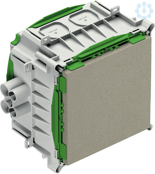 Universelles Einbaugehäuse, für Fertigteilbau, halogenfrei, zum Einbau von NV/HV/LED-Leuchten und Lautsprechern, Melde- und Rufsystemen, geeignet für Klebebefestigung, für die Installation von VDE geprüften Leuchten nach DIN EN 60598 (VDE 0711), sowie mit F-Kennzeichnung oder MM-Kennzeichnung, maximale Einbauhöhe für Leuchten, Lautsprecher, Melde und Rufsystemen: 100mm, Lampenleistung Halogen max. 50 W, Lampenleistung LED max. 20 W, Auslassöffnung: Fermacell(R)-Platte, variabel bis max. 150 x 150mm, 8 Kombi-Rohr-Einführungen 4 x 16mm, 4 x 19mm integrierte Rohrstopper und Zugentlastung für Rohre 16mm, 19mm