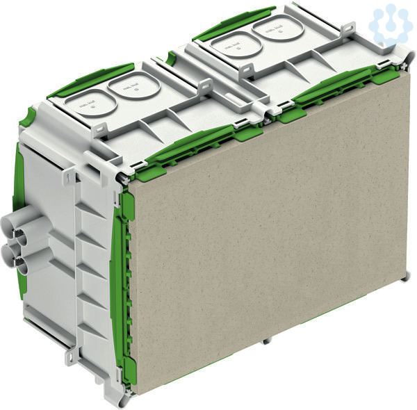 Universelles Einbaugehäuse, für Fertigteilbau, halogenfrei, zum Einbau von NV/HV/LED-Leuchten und Lautsprechern, Melde- und Rufsystemen, geeignet für Klebebefestigung, für die Installation von VDE geprüften Leuchten nach DIN EN 60598 (VDE 0711), sowie mit F-Kennzeichnung oder MM-Kennzeichnung, maximale Einbauhöhe für Leuchten, Lautsprecher, Melde und Rufsystemen: 130mm, Lampenleistung Halogen max. 100 W, Lampenleistung LED max. 47 W, Auslassöffnung: Fermacell(R)-Platte, variabel bis max. 200 x 300mm, 8 Kombi-Rohr-Einführungen 4 x M16, 4 x M19 integrierte Rohrstopper und Zugentlastung für Rohre 16mm, 19mm