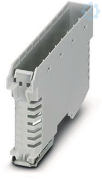 Tragschienengehäuse, Gehäuseunterteil mit Metallfußriegel, mit Funktions-Erdkontakt, mit Lüftungsschlitzen, Breite: 18,9 mm, Höhe: 109,6 mm, Tiefe: 64,3 mm, Farbe: lichtgrau (7035), Querverbindung: Tragschienen-Busverbinder (optional), Polzahl Querverbinder: 5