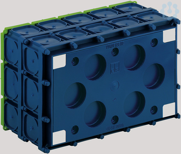 Einbaukasten für Betoneinbau, vorbereitet für Aufnahme der WK-Klemmen 2,5-25qmm, geeignet zur Aufnahme einer 40-poligen Telefon-Anschlussleiste, als Telefon-Durchgangskasten nach DIN 47614-615, oder als IBT-Verteilung UP 015 (1-reihig, 15 TE), halogenfrei, zum Einbau von NV/HV/LED-Leuchten und Lautsprechern, geeignet für alle Schalungsarten und Gegenschalung, für Nagel- und Magnetbefestigung, ohne Fermacell(R)-Platte, Lampenleistung max. 50W / LED 40W