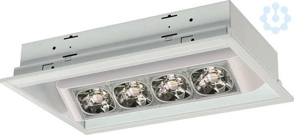LED-Strahler in eigenständigem Design für Deckeneinbau. Leuchtengehäuse aus Stahlblech, Strahlergehäuse aus Aluminiumdruckguss, weiß (ähnlich RAL9016), bzw. schwarz (ähnlich RAL9005) pulverbeschichtet. Lichteinheit über Kipp-Gelenk an dem Leuchtengehäuse angebracht, um 80° stufenlos schwenkbar für eine flexible Anwendung. Geräteträgerplatte aus verzinktem Stahlblech, trägt das Betriebsgerät, die Netzanschlussklemme mit Kabelzugentlastung und die Verbindungsleitung zum LED-Modul. Abdeckung aus thermisch beständigem Polycarbonat aufgeclipst. Lichteinheit mit 4 LED-COB-Modulen ausgestattet für hohe Lichtströme. Die speziell für die Regalbeleuchtung entwickelten, hochwertigen Optiken in Form von TIR-Linsen sorgen für eine effiziente Lichtlenkung. Schutzart IP20, Schutzklasse I. Strahler mit einer Lichteinheit. Montage: Einbau in gesägte Deckenöffnungen verschiedener Deckensysteme mit entsprechendem Befestigungssatz, oder Einlegemontage in Deckensysteme mit sichtbaren Tragschienen und eingelegten Deckenplatten. Fü