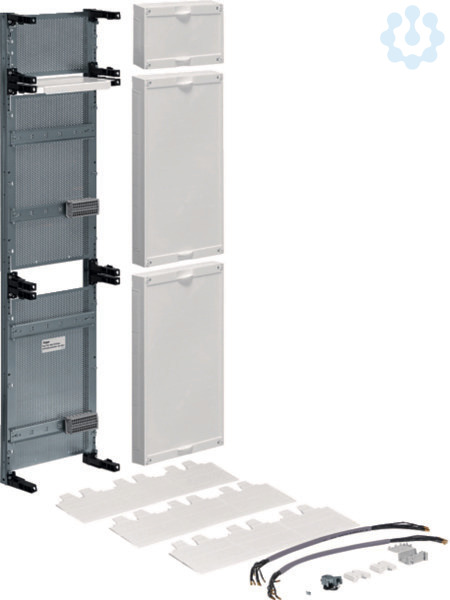 Einbausatz, univers Z, 1050x250mm, APZ 450mm, RfZ 450mm, HAN 150mm. Innenausbausystem zum Einbau in Schrankgehäusen nach DIN VDE 0603/1, bestehend aus HAN-, RfZ- und APZ-Funktionsflächen zur Aufnahme von Kommunikationsanwendungen sowie Gerätekomponenten für HAN-, RfZ- und APZ-Anwendungen. Vormontierter Einbausatz bestehend aus Lochblech-Montageplatten, Blechdicke 1mm. Schutzklasse II schutzisoliert. Berührungsschutzabdeckungen mit Vierpunkt-Befestigung, serienmäßig plombierbar und integriertem Griff. Mit Steuerleitungsverdrahtung und RJ45-Buchse beiliegend. Geschlossene Abdeckungen aus Kunststoff in RAL 9010. Abmessungen (HxBxT): 1050x250x125 mm.