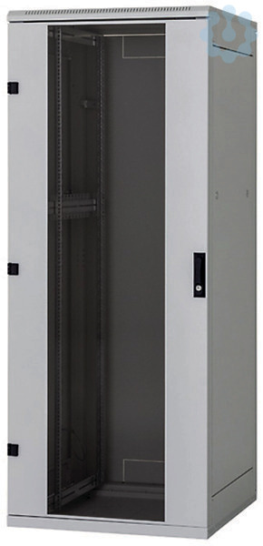 Bestandteil des Verteilers sind 4 (bei Verteilern tiefer als 800 mm: 6) verstellbare vertikale Rasterschienen für die Installation der Komponenten. Verteilerkonstruktion: geschraubte Stahlkonstruktion mit abnehmbaren Wänden. Glastür (Ein- bzw. Zweiflügeltüren in den Ausführungen als Vollblech-, perforierte 80 % Luftdurchlass auf Anfrage erhältlich). Sie können vorn oder hinten am Verteiler montiert werden. Diese Schränke sind