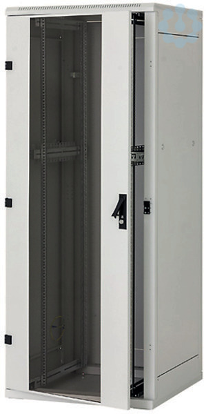 Bestandteil des Verteilers sind 4 (bei Verteilern tiefer als 800 mm: 6) verstellbare vertikale Rasterschienen für die Installation der Komponenten. Verteilerkonstruktion: geschweißte Stahlkonstruktion mit abnehmbaren Wänden. Glastür (Ein- bzw. Zweiflügeltüren in den Ausführungen als Vollblech-, perforierte 80 % Luftdurchlass auf Anfrage erhältlich). Sie können vorn oder hinten am Verteiler montiert werden. Diese Schränke sind für den Einbau von Daten- und Telekommunikationsanlagen und ihrer Verteilersysteme bestimmt. Der V