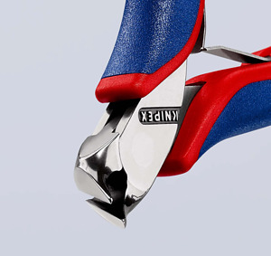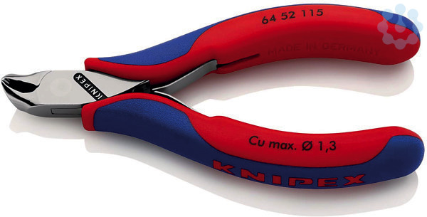 64 52 115 Elektronik-Vornschneider Präzisionszangen für feinste Schneidarbeiten, z. B. in Elektronik und Feinmechanik. Durchgestecktes Präzisionsgelenk. Reibungsarme Doppelfeder für ein sanftes und gleichmäßiges Öffnen. Die Politur oder Spiegelpolitur bietet in Verbindung mit einem feinen Ölfilm einen guten Rostschutz ? keine Störungen im Schaltkreis durch abblätternde Chromteile. Schneiden zusätzlich lasergehärtet, Schneidenhärte mindestens 56 HRC. Vornschrägschneider, kurzer Kopf, ohne Facette, zum flächengleichen Trennen, ?=27°. - Schneidwerte weicher Draht (Durchmesser): Ø 1,3mm - Kopfbreite (A): 11mm - Backenlänge (B): 10mm - Backendicke (am Gelenk) (D): 7mm - Schneidenlänge mm (C): 12mm