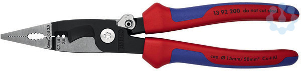 13 92 200 Elektro-Installationszange 6 Funktionen in einer Zange. Multifunktionszange für die Elektroinstallation. zum Greifen von Flach- und Rundmaterial, Biegen, Entgraten, Kabelschneiden, Abisolieren und Crimpen von Aderendhülsen. Glatte Greifflächen an der Spitze für ein beschädigungsfreies Greifen von Einzeladern. profilierte Greifflächen und Brennerloch zum Greifen von Flach- und Rundmaterial. Markante Außenkante an den Greifflächen zum Bearbeiten von Unterputzdosen und Entgraten von Durchführungslöchern. Abisolierlöcher für Leiter 0,75 - 1,5 mm² und 2,5 mm². Crimpnest für Aderendhülsen 0,5 - 2,5 mm². Kabelschere mit Präzisionsschneiden (induktiv gehärtet) für Cu- und Al-Kabel bis 5 x 2,5 mm² / Ø 15 mm. Schlanke Bauform für gute Zugänglichkeit. Geschraubtes Gelenk: präziser, spielfreier Gang der Zange. bei den Modellen mit im Gelenk integrierter Öffnungsfeder hält die aktivierte Sperrklinke die Schneiden geschlossen während die anderen Funktionen erhalten bleiben. mit dem intelligenten Zuhaltemechanismu
