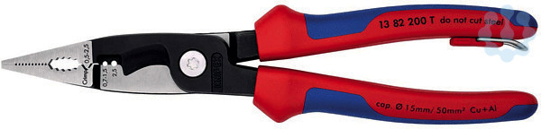 13 82 200 T Elektro-Installationszange 6 Funktionen in einer Zange. Multifunktionszange für die Elektroinstallation. zum Greifen von Flach- und Rundmaterial, Biegen, Entgraten, Kabelschneiden, Abisolieren und Crimpen von Aderendhülsen. Glatte Greifflächen an der Spitze für ein beschädigungsfreies Greifen von Einzeladern. profilierte Greifflächen und Brennerloch zum Greifen von Flach- und Rundmaterial. Markante Außenkante an den Greifflächen zum Bearbeiten von Unterputzdosen und Entgraten von Durchführungslöchern. Abisolierlöcher für Leiter 0,75 - 1,5 mm² und 2,5 mm². Crimpnest für Aderendhülsen 0,5 - 2,5 mm². Kabelschere mit Präzisionsschneiden (induktiv gehärtet) für Cu- und Al-Kabel bis 5 x 2,5 mm² / Ø 15 mm. Schlanke Bauform für gute Zugänglichkeit. Geschraubtes Gelenk: präziser, spielfreier Gang der Zange. Zange mit Befestigungsöse zum Anbringen einer Absturzsicherung. - Schneidwert Cu-Kabel, mehrdrähtig: Ø 15mm - Schneidwert Cu-Kabel, mehrdrähtig: 50mm² - Abisolierwerte für Einzeladern: 0,75???1,5mm²?/ 2