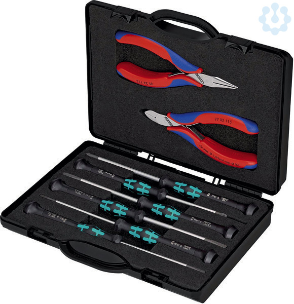00 20 18 Elektronikzangen-Set Abmessungen, geschlossen (B x H x T): 215 x 160 x 50 mm. 8-teilig, bestückt mit zwei Elektronikzangen und sechs Elektronik-Schraubendrehern. praktische Aufbewahrungs-Box, aus schlagfestem Kunststoff, mit Schaumstoffeinlagen. Lieferumfang: 1 x 35 22 115 KNIPEX Elektronik-Greifzange, 1 x 77 02 115 KNIPEX Elektronik-Seitenschneider, 1 x 118008 Wera Schraubendreher für Schlitzschrauben 2035 (0,4 x 2,5 x 80 mm), 1 x 118010 Wera Schraubendreher für Schlitzschrauben 2035 (0,5 x 3,0 x 80 mm), 1 x 118012 Wera Schraubendreher für Schlitzschrauben 2035 (0,6 x 3,5 x 80 mm), 1 x 118014 Wera Schraubendreher für Schlitzschrauben 2035 (0,8 x 4,0 x 80 mm), 1 x 118022 Wera Schraubendreher, Kreuzschlitz Phillips® 2050 PH (PH0 x 60 mm), 1 x 118024 Wera Schraubendreher, Kreuzschlitz Phillips® 2050 PH (PH1 x 80 mm),