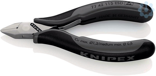 77 42 115 ESD Elektronik-Seitenschneider ESD Für feine Schneidarbeiten, z. B. in Elektronik und Feinmechanik. Griffe elektrisch ableitend ? dissipativ. Stabiles, durchgestecktes und spielfreies Gelenk. Reibungsarme Doppelfeder für ein sanftes und gleichmäßiges Öffnen. Die Spiegelpolitur bietet in Verbindung mit einem feinen Ölfilm einen guten Rostschutz ? keine Störungen im Schaltkreis durch abblätternde Chromteile. Schneiden zusätzlich induktiv gehärtet, Schneidenhärte ca. 62 HRC. Griffe mit zweifarbigen Mehrkomponenten-Hüllen schwarz/grau. spitzer Kopf ohne Facette. Schneidenhärte ca. 57 HRC. - Schneidwerte mittelharter Draht (Durchmesser): Ø 0,8mm - Schneidwerte weicher Draht (Durchmesser): Ø 0,3???1,3mm - Backenlänge (B): 14mm - Backendicke (am Gelenk) (D): 7mm - Kopfbreite (A): 11mm - ESD: Ja