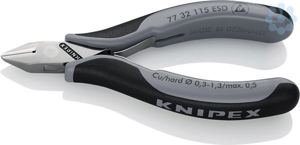 77 32 115 ESD Elektronik-Seitenschneider ESD Für feine Schneidarbeiten, z. B. in Elektronik und Feinmechanik. Griffe elektrisch ableitend ? dissipativ. Stabiles, durchgestecktes und spielfreies Gelenk. Reibungsarme Doppelfeder für ein sanftes und gleichmäßiges Öffnen. Die Spiegelpolitur bietet in Verbindung mit einem feinen Ölfilm einen guten Rostschutz ? keine Störungen im Schaltkreis durch abblätternde Chromteile. Schneiden zusätzlich induktiv gehärtet, Schneidenhärte ca. 62 HRC. Griffe mit zweifarbigen Mehrkomponenten-Hüllen schwarz/grau. spitzer Kopf, mit kleiner Facette. Schneidenhärte ca. 60 HRC. - Schneidwerte mittelharter Draht (Durchmesser): Ø 1,0mm - Schneidwerte harter Draht (Durchmesser): Ø 0,5mm - Schneidwerte weicher Draht (Durchmesser): Ø 0,3???1,3mm - Backenlänge (B): 14mm - Backendicke (am Gelenk) (D): 7mm - Kopfbreite (A): 11mm - ESD: Ja