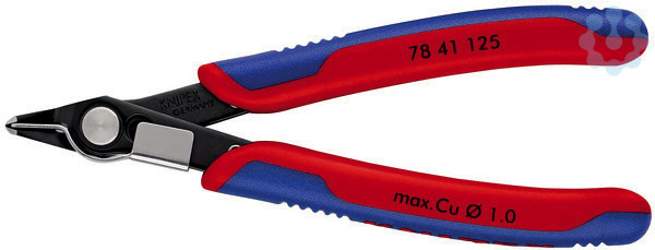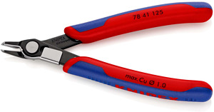 78 41 125 Electronic Super Knips® Präzisionszangen für feinste Schneidarbeiten, z. B. in Elektronik und Feinmechanik. Geschliffene, sehr scharfe Schneiden ohne Facette. Exakt geformte Spitzen schneiden auch anliegende Drähte ab Ø 0,2 mm. Scherschnitt mit kontrolliertem Micro-Schneidkantenversatz für lange Lebensdauer und ultrapräzisen Schnitt auch dünnster Drähte. Gelenk mit Edelstahlniet. Extrem leichter Gang für ermüdungsarmes Arbeiten. Mit Öffnungsfeder und Öffnungsbegrenzung. mit Drahtklemme - kein unkontrolliertes Wegspringen der Drahtabschnitte. mit schmalem Kopf. Schneiden zusätzlich induktiv gehärtet, Schneidenhärte ca. 60 HRC. Spezial-Werkzeugstahl, brüniert. - Schneidwerte weicher Draht (Durchmesser): Ø 0,2???1mm - Backenlänge (B): 9mm - Backendicke (am Gelenk) (D): 7,5mm - Kopfbreite (A): 12,5mm