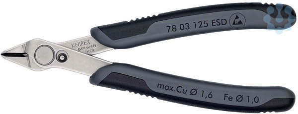 78 03 125 ESD Electronic Super Knips® ESD Präzisionszangen für feinste Schneidarbeiten, z. B. in Elektronik und Feinmechanik. Griffe elektrisch ableitend ? dissipativ. Geschliffene, sehr scharfe Schneiden ohne Facette. Scherschnitt mit kontrolliertem Micro-Schneidkantenversatz für lange Lebensdauer und ultrapräzisen Schnitt auch dünnster Drähte. Exakt geformte Spitzen schneiden auch anliegende Drähte ab Ø 0,2 mm. Gelenk mit Edelstahlniet. Extrem leichter Gang für ermüdungsarmes Arbeiten. Mit Öffnungsfeder und Öffnungsbegrenzung. Schneidenhärte ca. 54 HRC. INOX-Werkzeugstahl. - Schneidwerte mittelharter Draht (Durchmesser): Ø 1,0mm - Schneidwerte weicher Draht (Durchmesser): Ø 0,2???1,6mm - Backenlänge (B): 9mm - Backendicke (am Gelenk) (D): 7,5mm - Kopfbreite (A): 13,5mm - ESD: Ja