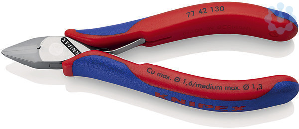77 42 130 Elektronik-Seitenschneider Für feine Schneidarbeiten, z. B. in Elektronik und Feinmechanik. Belastungsoptimierte Formgebung für ein direkteres Arbeitsgefühl. Stabiles, durchgestecktes und spielfreies Gelenk. Reibungsarme Doppelfeder für ein sanftes und gleichmäßiges Öffnen. Die Politur oder Spiegelpolitur bietet in Verbindung mit einem feinen Ölfilm einen guten Rostschutz ? keine Störungen im Schaltkreis durch abblätternde Chromteile. Schneiden zusätzlich lasergehärtet, Schneidenhärte mindestens 60 HRC. Schlanke, zum Zangenkopf hochgezogene Hüllen bieten sichere und komfortable Führung auch zwischen Daumen und Zeigefinger. spitzer Kopf ohne Facette. Schneidenhärte ca. 57 HRC. - Schneidwerte mittelharter Draht (Durchmesser): Ø 1,3mm - Schneidwerte weicher Draht (Durchmesser): Ø 0,3???1,6mm - Backenlänge (B): 18mm - Backendicke (am Gelenk) (D): 9,5mm - Kopfbreite (A): 15mm