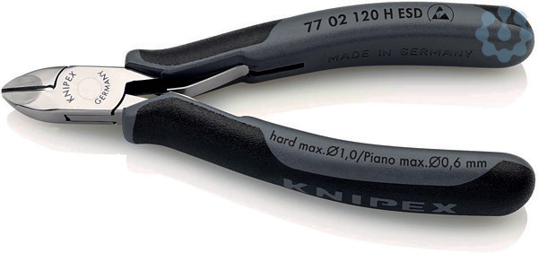 77 02 120 H ESD Elektronik-Seitenschneider mit eingesetzter Hartmetallschneide ESD Für extreme Anforderungen an schneidende Zangen durch harte oder zähe Materialien, z. B. Piano-, Nickel-, Wolfram- und Diodendraht, wie sie immer häufiger in der Elektronik- und Luft-/Raumfahrtindustrie eingesetzt werden. Immer das richtige Schneidwerkzeug, auch bei härtestem Material. Präzisions-Hartmetallschneiden eingelötet in geschmiedete Rohlinge. Stabiles, durchgestecktes und spielfreies Gelenk. Schneidenhärte der HM-Schneiden 80 - 83 HRC. Zangen mit Hartmetallschneiden haben eine wesentlich höhere Standzeit als solche mit konventionellen Schneiden. Dauerhaft zuverlässige Schneidergebnisse durch die Vermeidung von Schneidendeformationen durch Überlastung. Hohe Kostenersparnis durch längere Lebensdauer der Zangen. Griffe elektrisch ableitend ? dissipativ. - Schneidwerte mittelharter Draht (Durchmesser): Ø 1,4mm - Schneidwerte harter Draht (Durchmesser): Ø 1,0mm - Schneidwerte Pianodraht (Durchmesser): Ø 0,6mm - Schneidwert